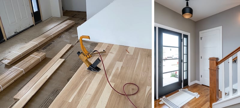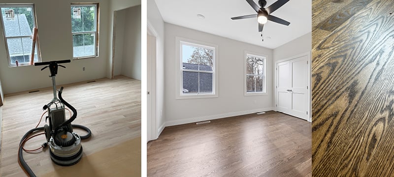 📸 TOP & BOTTOM LEFT: red oak flooring with a medium stain has a variable color depending on light; BOTTOM RIGHT: white oak with no stain, just a sealer, to showcase the natural grains.