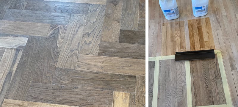 📸 LEFT: Walnut flooring in a herringbone pattern (love); RIGHT: my colleague tries four stain colors on one inch red oak flooring; immediately ruling out bottom left (too gray) and top right (too yellow), which do you think she choose?