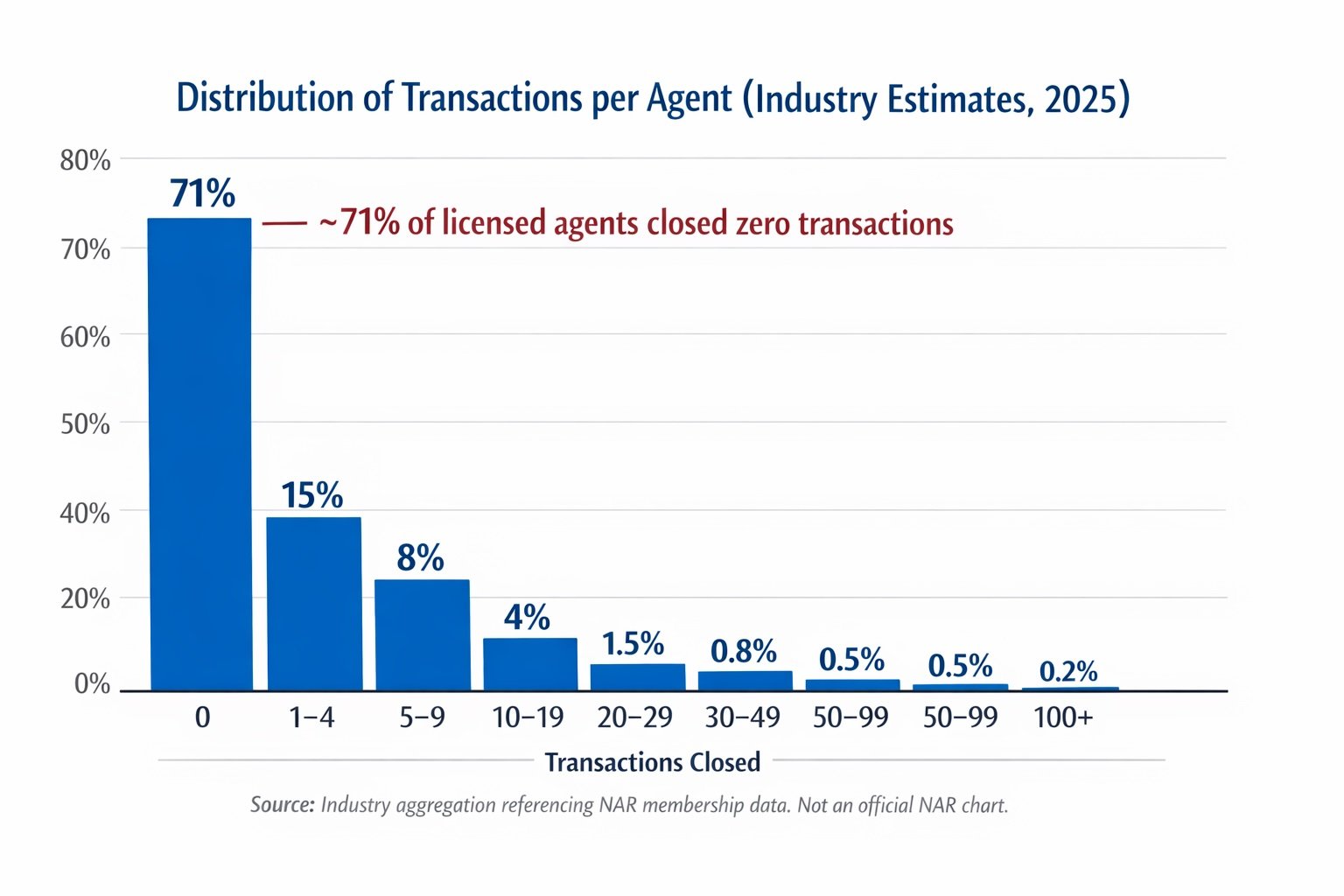 Recent data from the National Association of Realtors shows how small the real estate industry really is. 71.1% of agents did zero transactions last year. Zip. None. Not even one. Another 14.9% closed just 1–4 deals, which means 85% of licensed agents did four or fewer transactions in an entire year. At that point, let’s be honest—are you actively practicing real estate… or just holding a license?