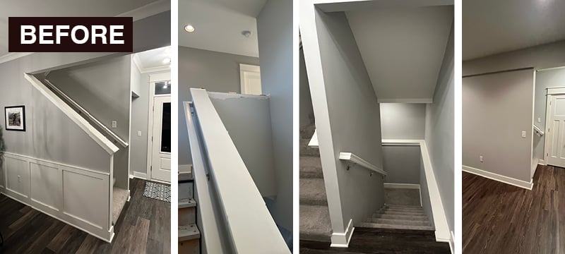 My team member, Andrew Kubinski, experienced this firsthand in his own home. The original design featured walled-in stairs—one separating the main-level foyer from the upper landing, another closing off the lower-level family room. His recent renovation removed both walls, replacing them with open railings and a U-shaped design that visually connects all three levels.