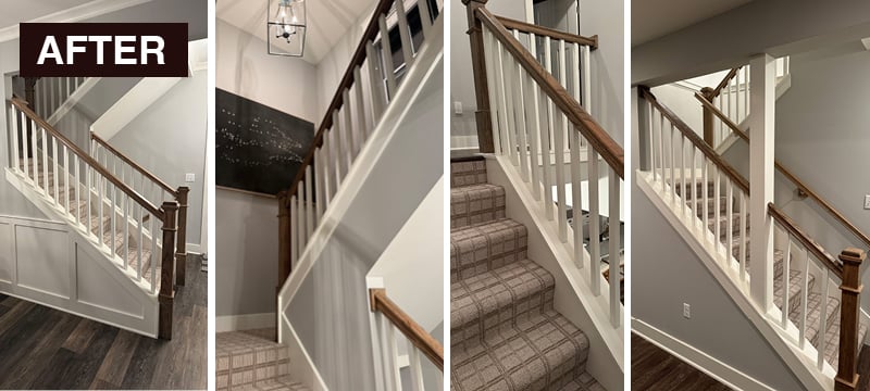 📸 Above: Custom metal railings in a black powder coat finish by Newport Fabrication on ankle-high walls with synthetic carpet. This was a whole-house remodel project where I had the lower level stairs wall, photoed on the right two photos, opened from a prior wall. The small space now feels more open and inviting.