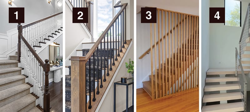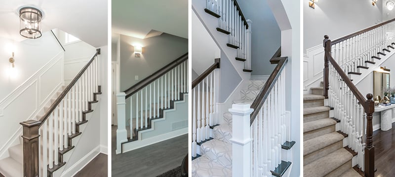 📸 Left: wood square banister; 📸 Center Left: wood candlestick banister; 📸 Center Right: wood pin top and ornate banister. (four designs built by Elevation Homebuilders)