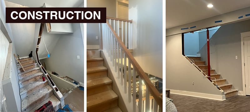 📸 Left: Construction begins in the foyer removing the previous full wall that divided the staircase; 📸 Center: Carpenters install wood banisters on an ankle-high design leaving the railing and newel post to be stained; 📸 Right: Looking from the family room to the staircase, the stairs now open into the family room but a support beam is deemed to be too expensive to remove.