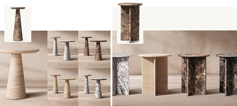 Playful and sculptural, with tapered bases and slim tops that echo the exuberance of 1980s Italian postmodern design. Available in six striking marble and travertine options—each stone telling its own story through veining and texture.