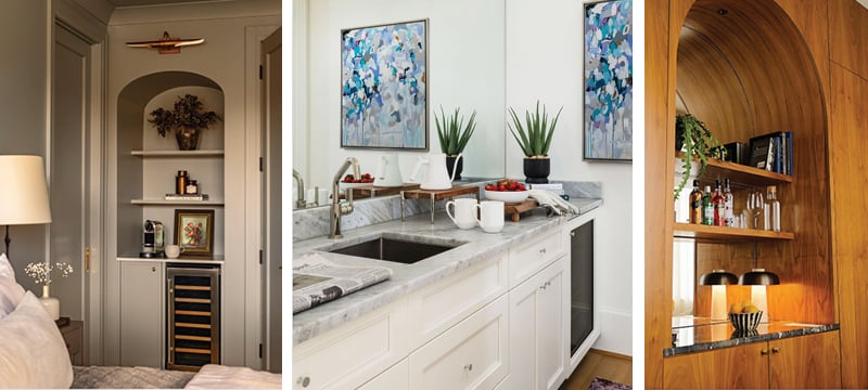 Often featuring a built-in beverage refrigerator, one or two cabinets, a few floating shelves or clean backsplash, and an espresso machine, glassware and a restrained selection of spirits. It’s not a party zone, it’s a private hospitality area.