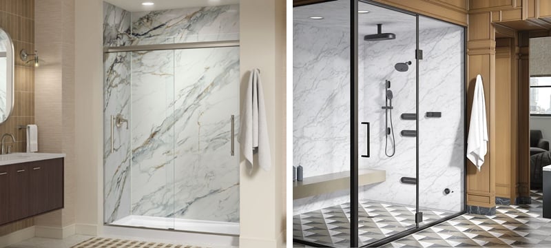 📸 BOTTOM: Kohler’s LuxStone shower walls mimic the look of massive slabs using crushed stone technology—engineered for durability, ultra-low maintenance, and fast installation that reduces labor costs